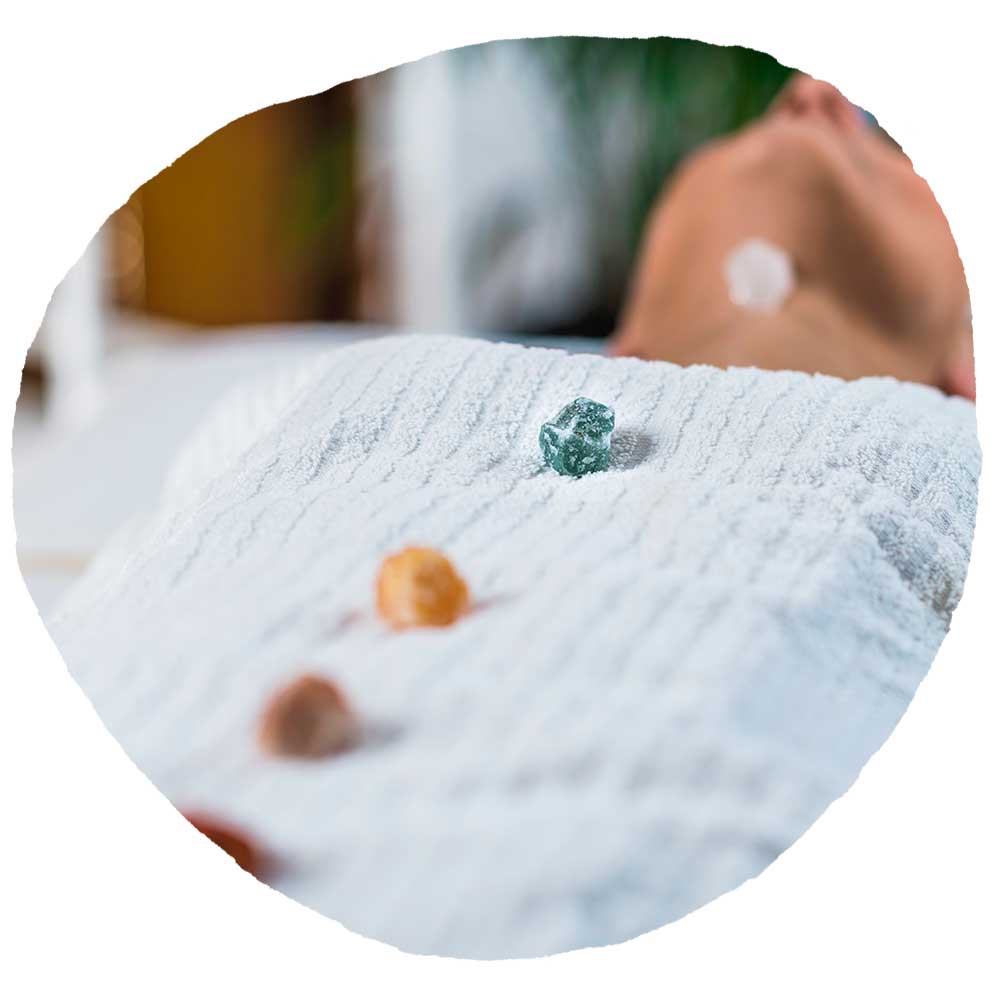 Kim will have you lying on the massage table, and whilst using meditation techniques, places crystals on corresponding chakra areas to balance them.